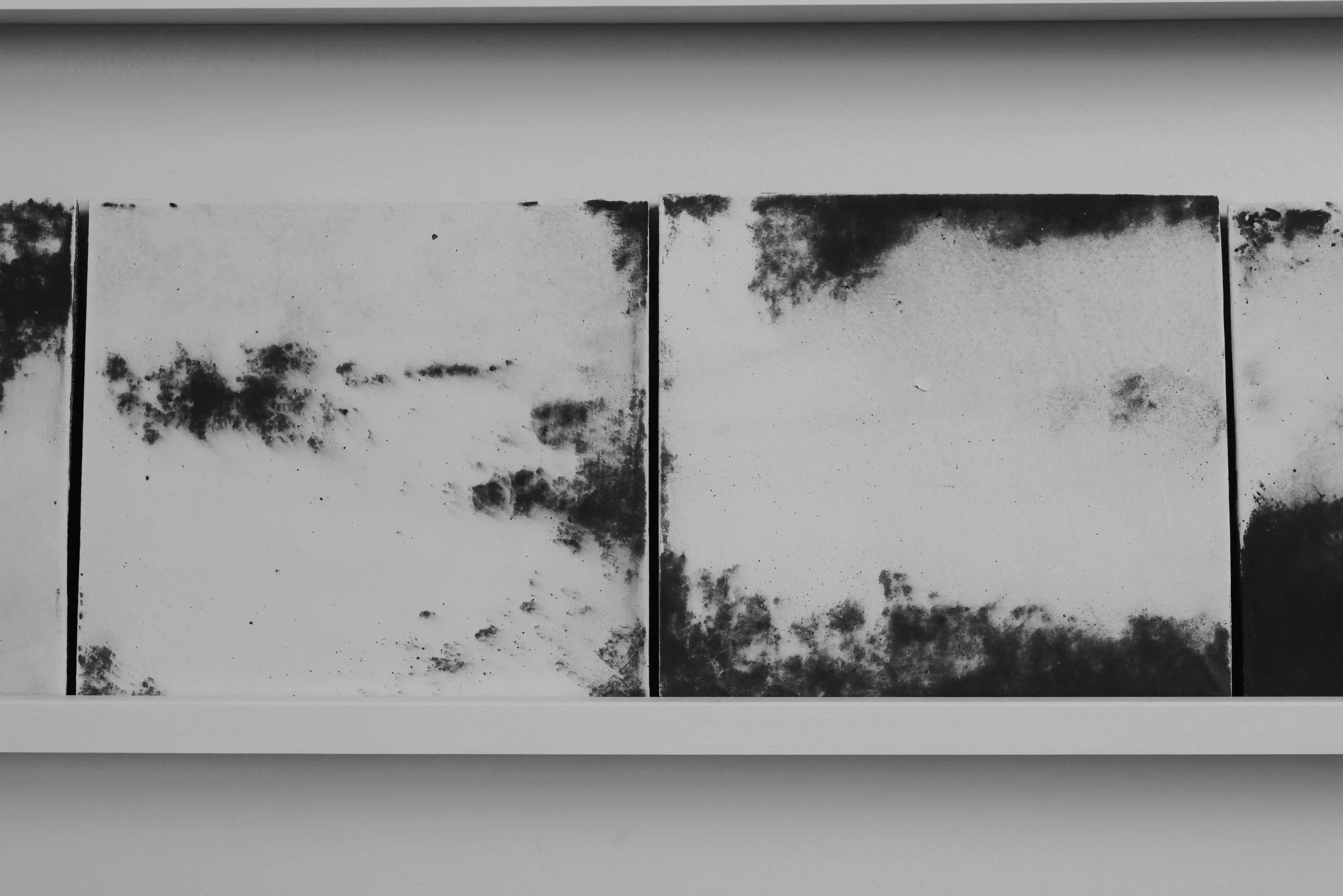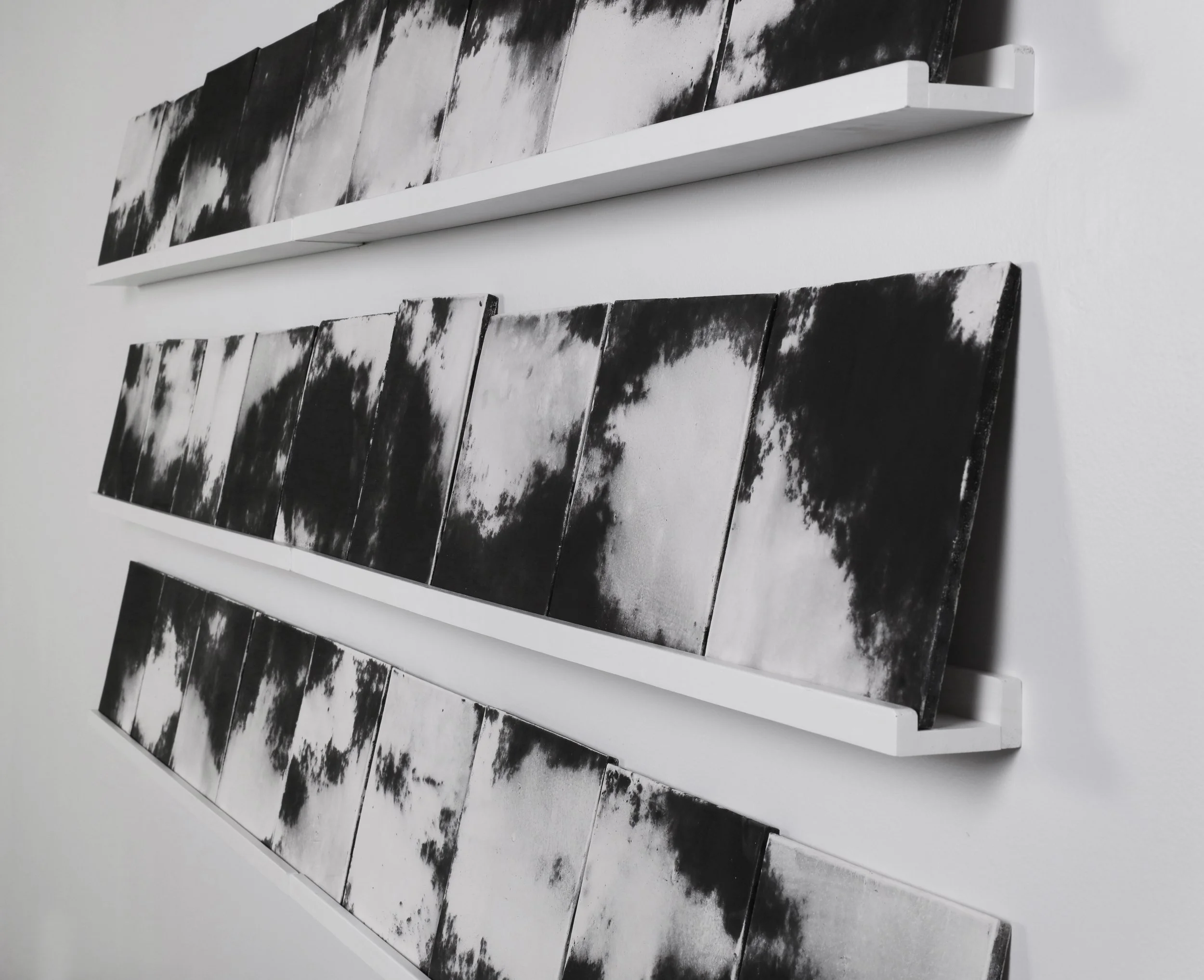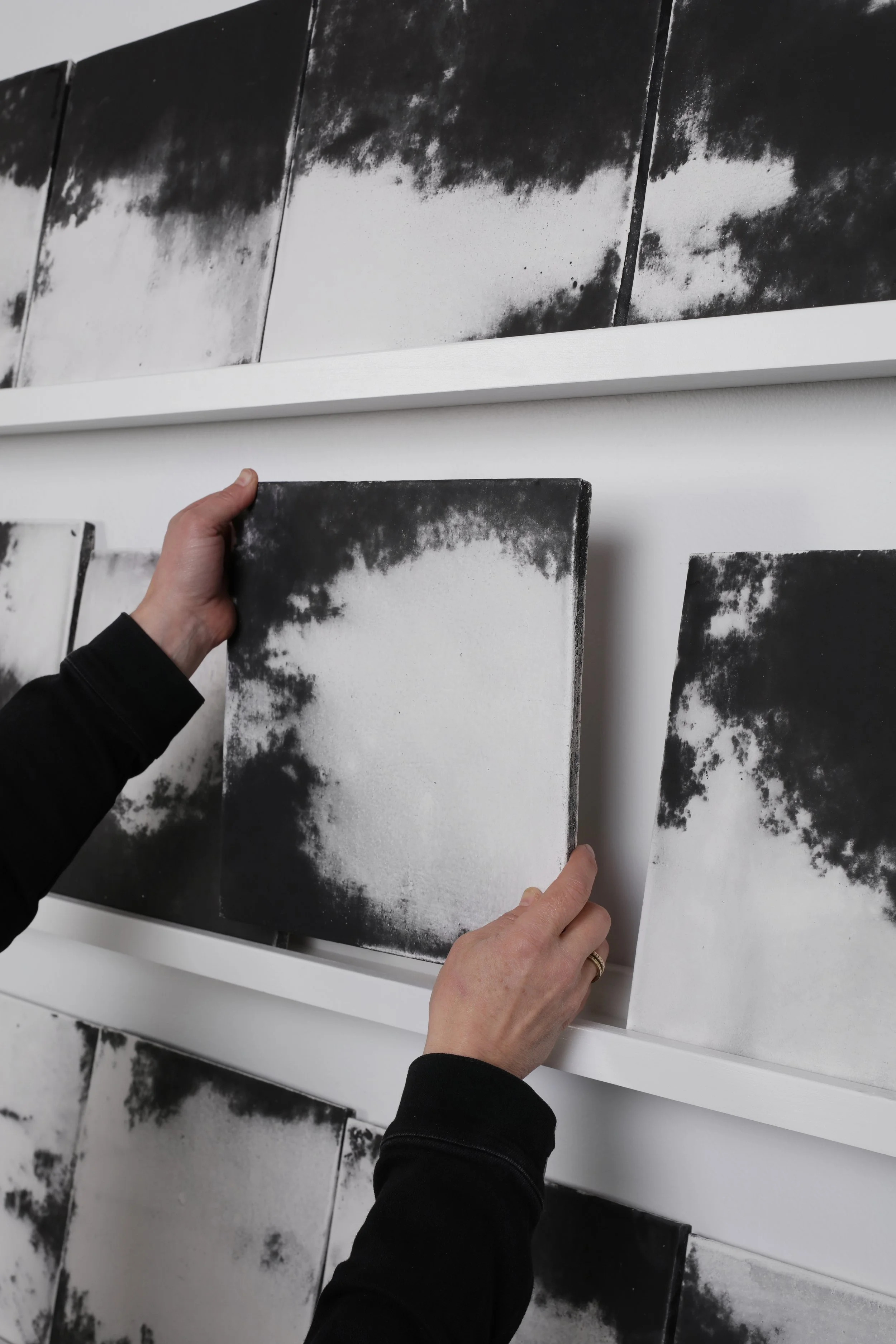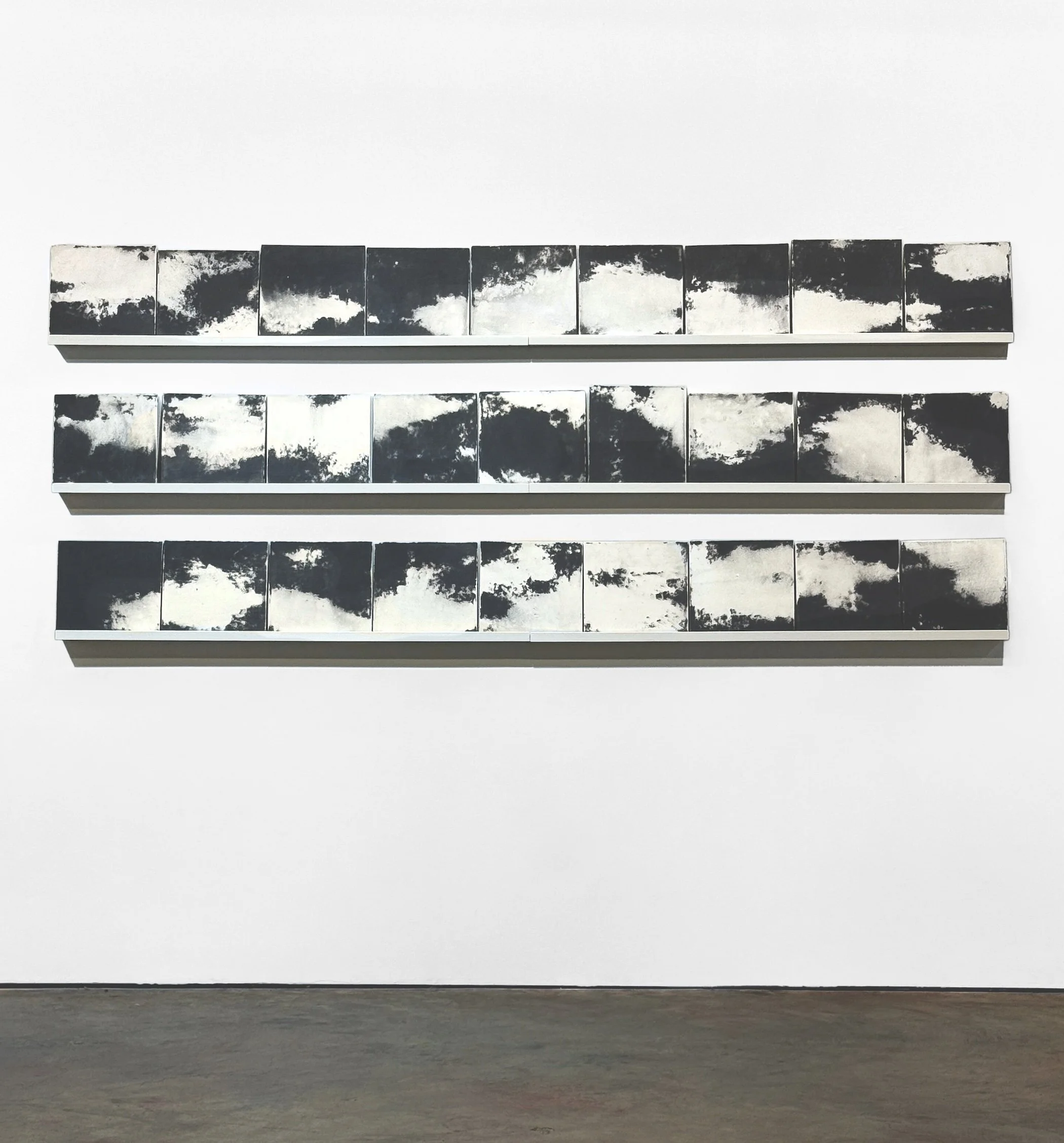 Rainwater runoff erodes ceramic pigments, revealing the clay beneath. The panels are then fired to preserve (fossilize) the effects of the rain. 114" X 42”, 2025