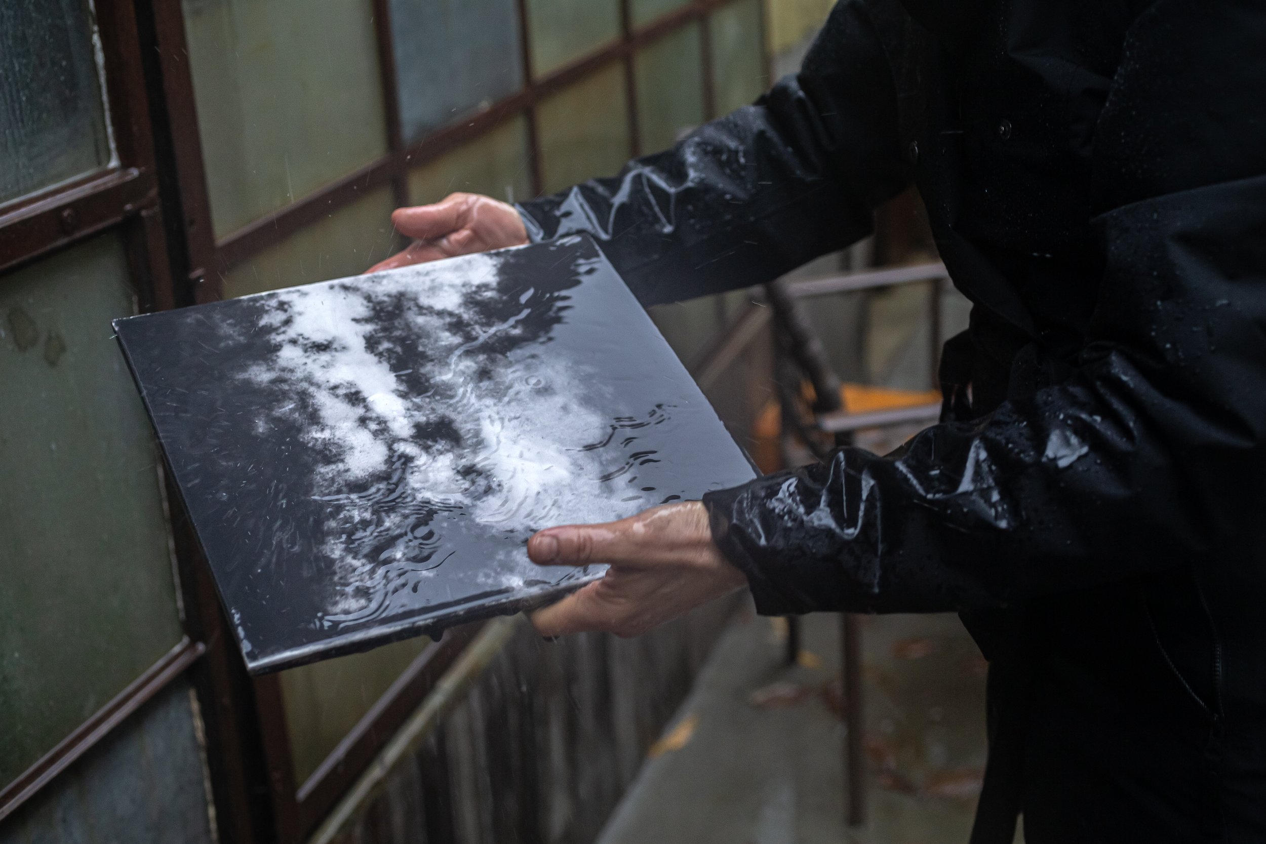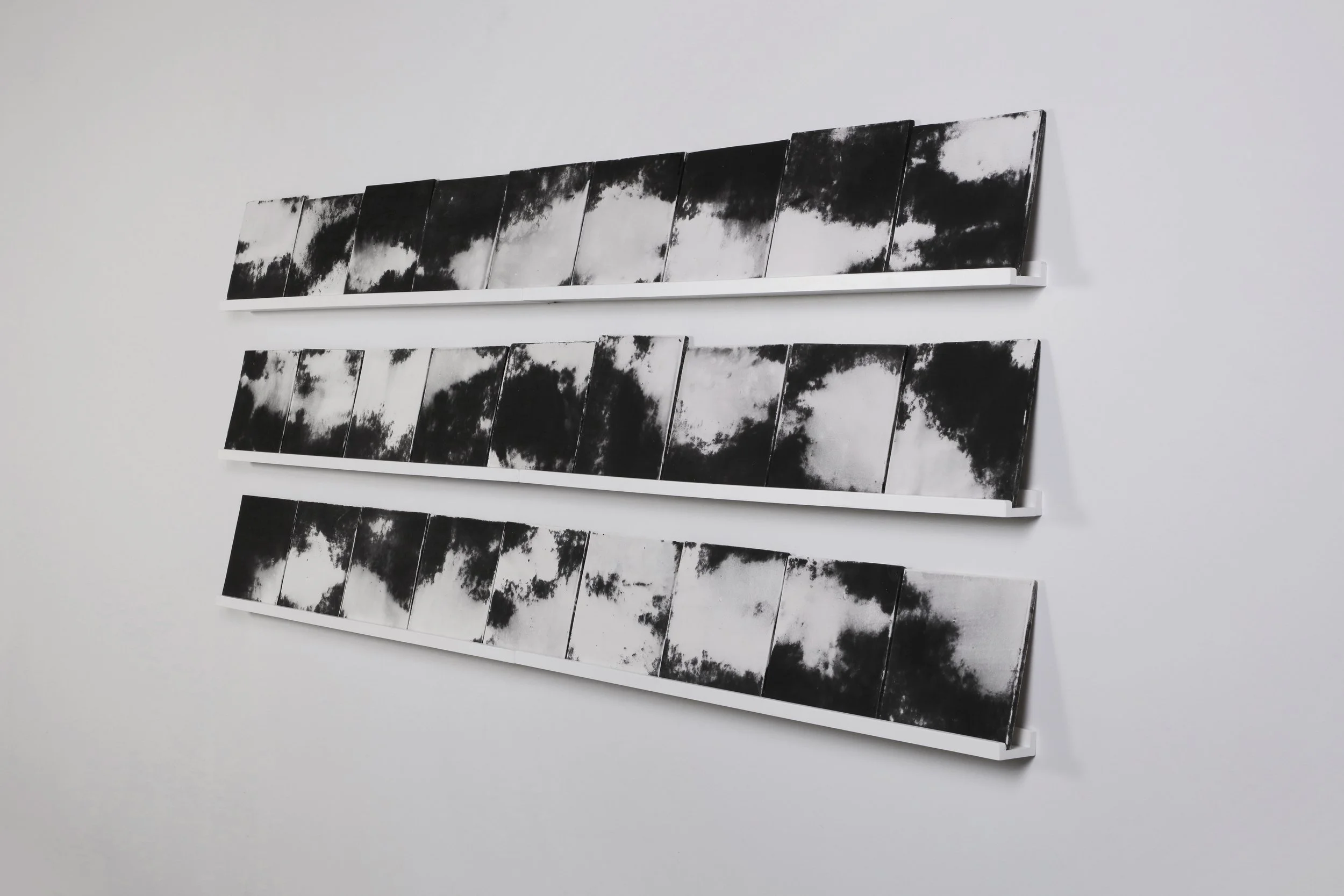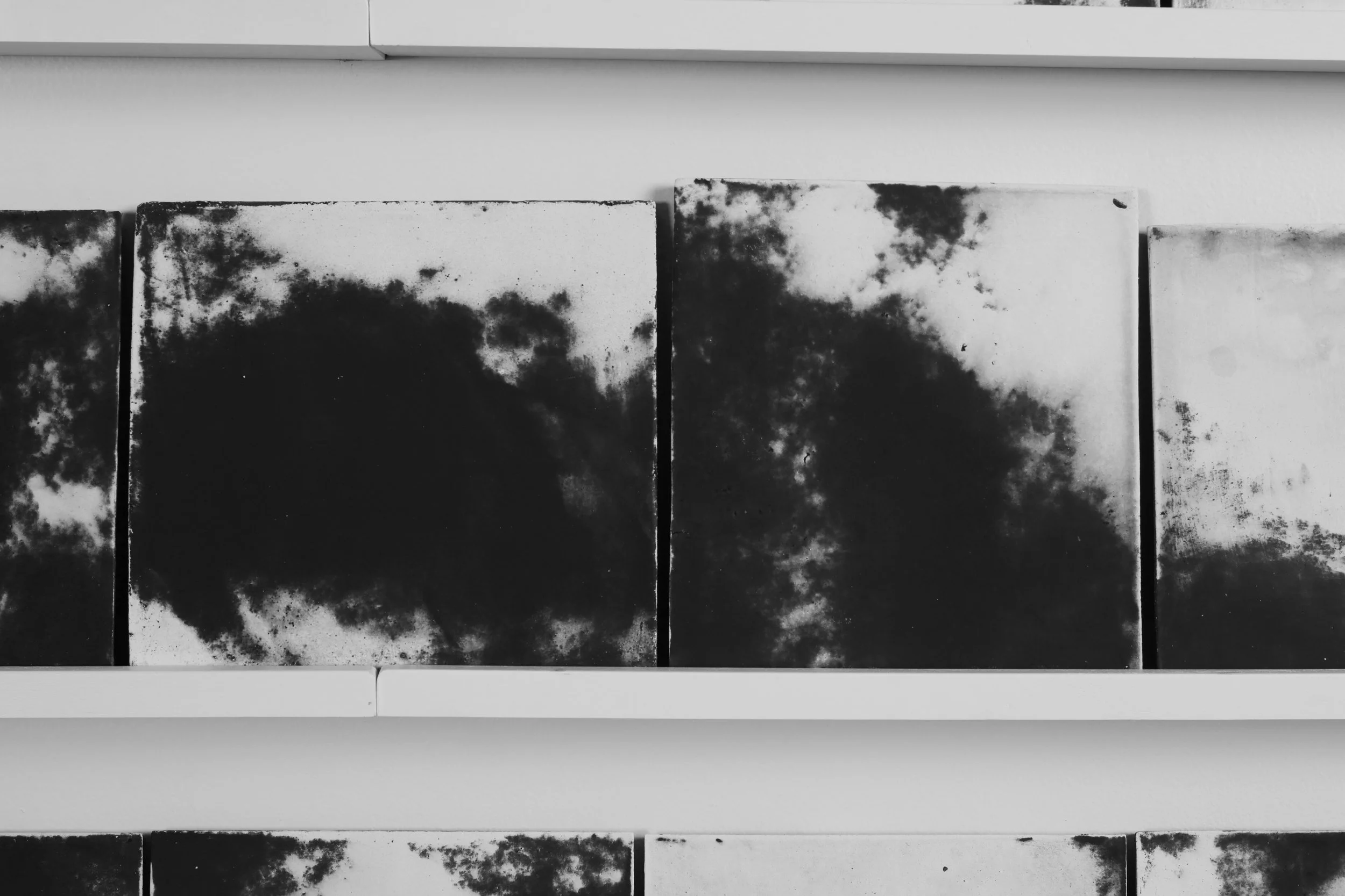Rainwater runoff erodes ceramic pigments, revealing the clay beneath. The panels are then fired to preserve (fossilize) the effects of the rain. 114" X 42”, 2025