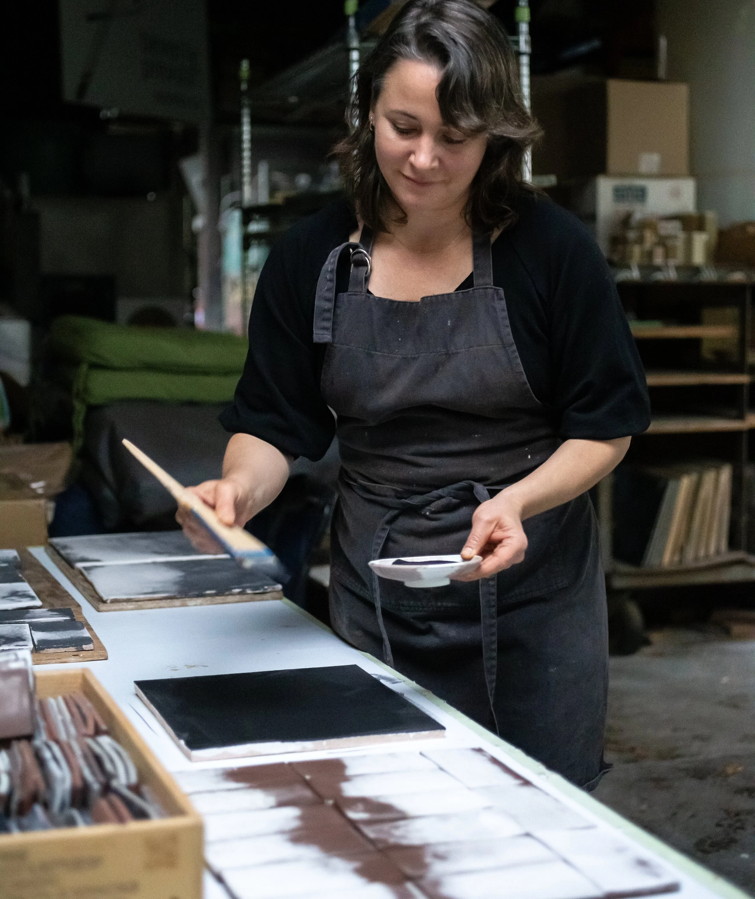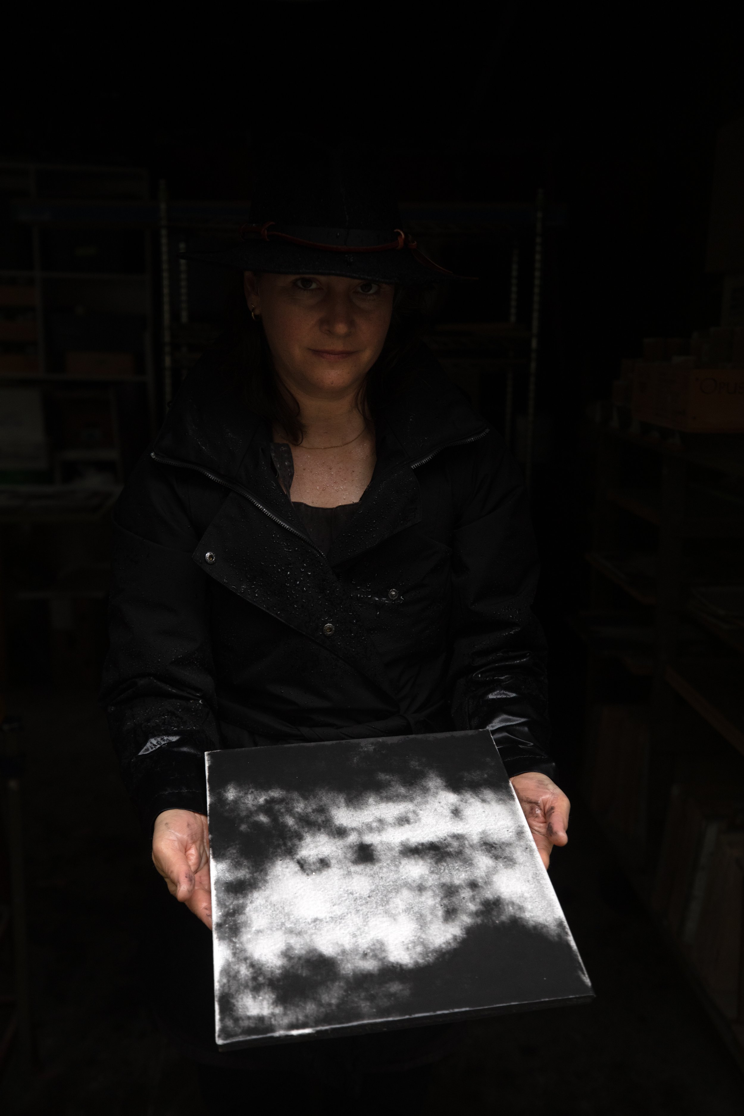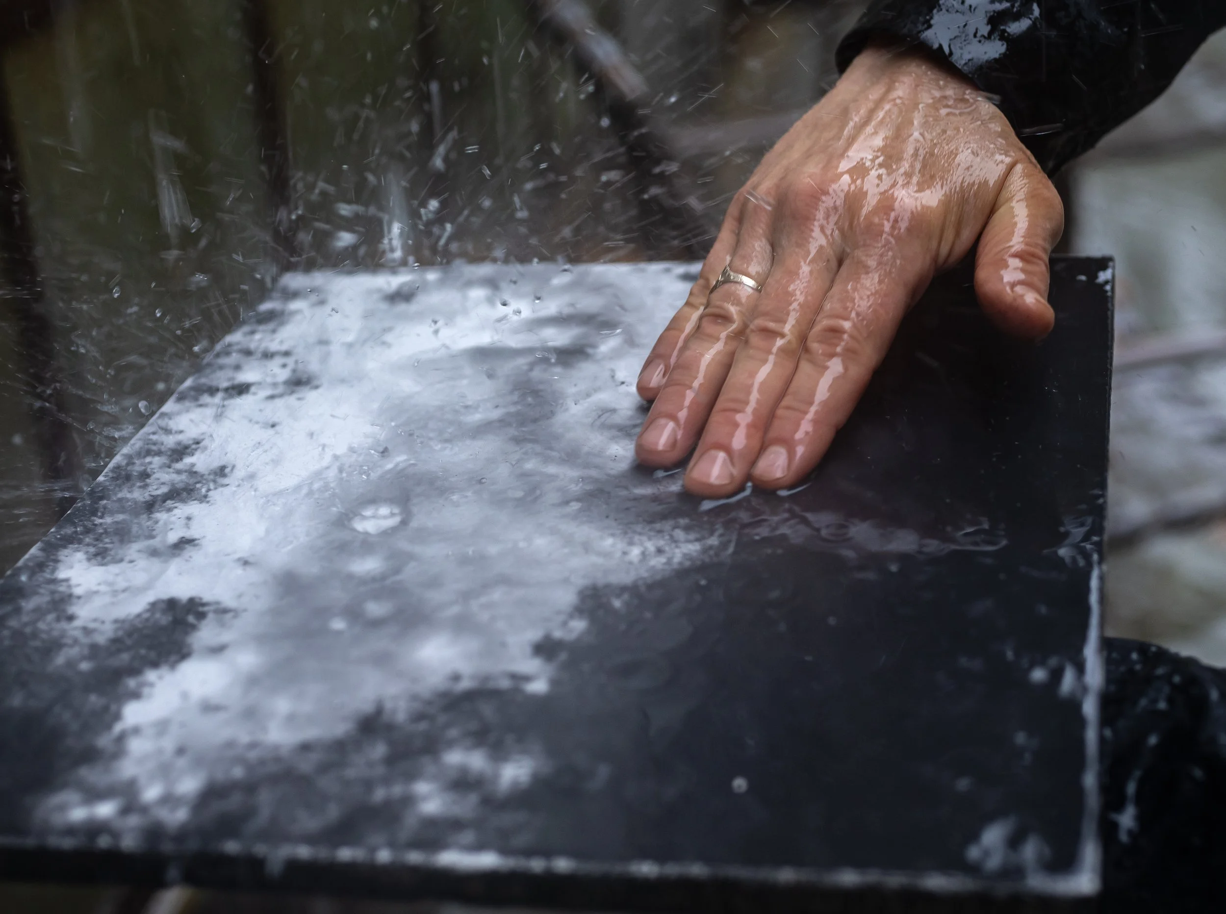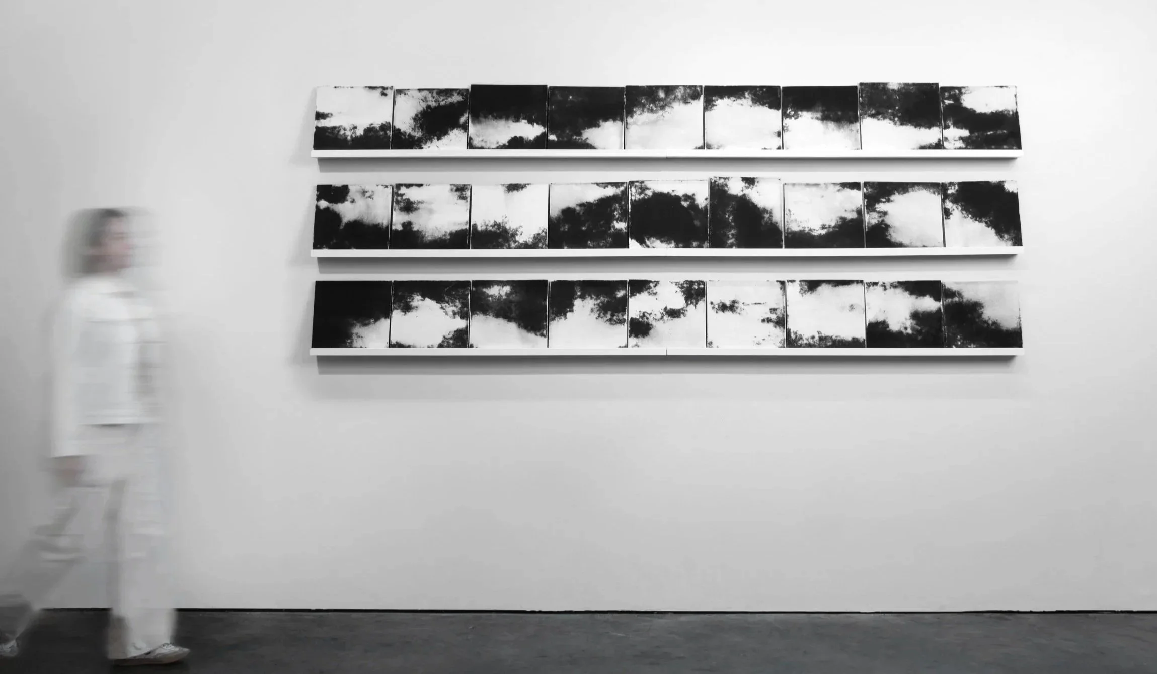 Rainwater runoff erodes ceramic pigments, revealing the clay beneath. The panels are then fired to preserve (fossilize) the effects of the rain. 114" X 42”, 2025